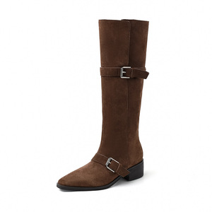 レイジースタイルツーウェアウエスタンパイルブーツ2025冬厚いミディアムヒールスクエアトゥ牛革スエードベルトバックルハイブーツ女性用