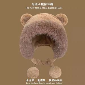 卡通可爱黄油小熊显脸小毛绒帽女秋冬季保暖防寒小熊帽护耳雷锋帽