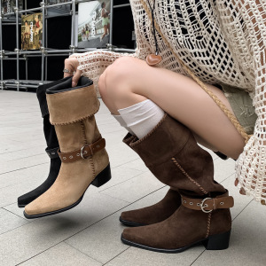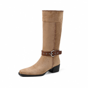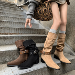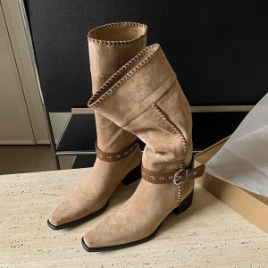 设计师款拼色绒面皮带扣两穿堆堆靴2025秋冬粗中跟方头高筒长靴女