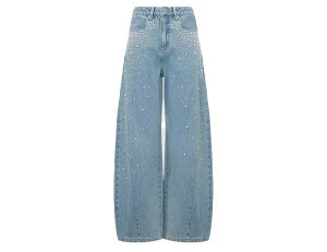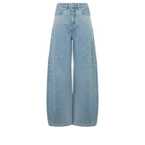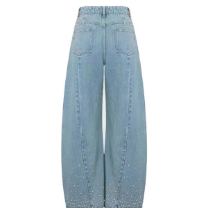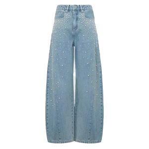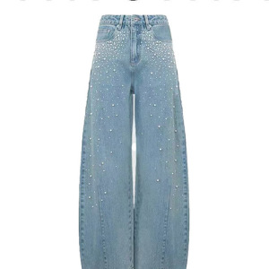 2025夏季复古新款阔腿宽松弯刀裤休闲裤闪钻珍珠做旧牛仔裤女