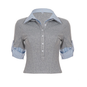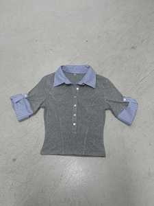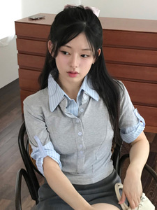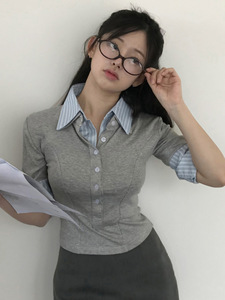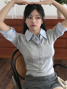 2025 アメリカンレトロフェイクツーピースストライプシャツカジュアル個性ホットガールレディーススリムで多用途なポロカラートップ