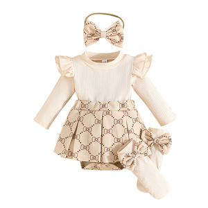 跨境专供—女婴春秋款甜美连体衣 米色三角哈衣+头巾+配套袜子