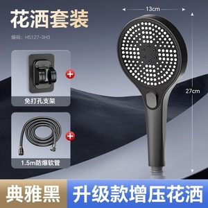 【典雅黑】三档增压花洒+1.5米防爆管+免打孔支架