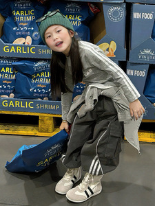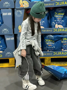 2025女童秋款套装灰色假两件上衣灰色工装裤套装