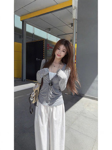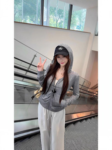 韩系薄款条纹拉链连帽长袖外套女2025夏季新款修身显瘦设计感开衫