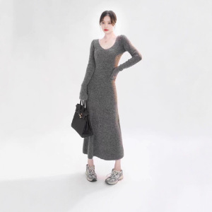 女装新款针织连衣裙女秋冬气质长款过膝内搭修身V领打底毛衣裙女