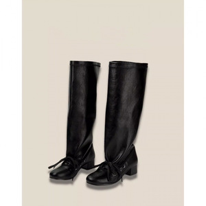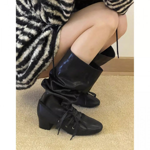 圆头粗跟高筒小众系带堆堆靴子女2025秋季新款真皮韩版长筒骑士靴