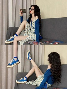 早秋装搭配一整套小个子茶系穿搭套装女蓝色碎花吊带连衣裙两件套