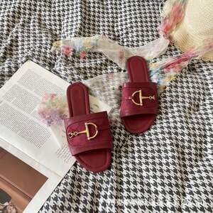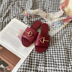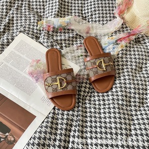 G家2025新款平底拖鞋经典印花帆布一字拖真皮尖头五金饰扣拖鞋