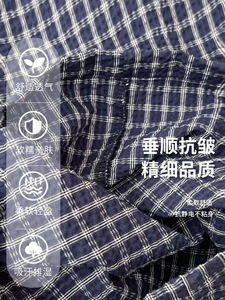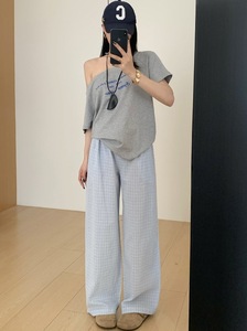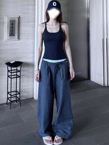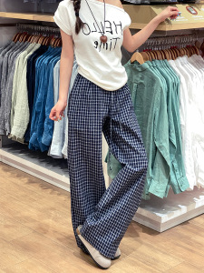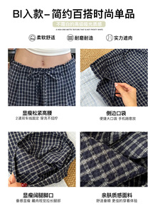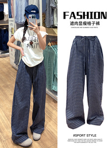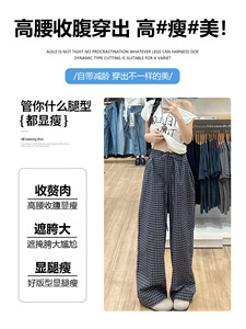 蓝色复古木耳边格子休闲裤女秋季2025新款高腰显瘦宽松直筒阔腿裤