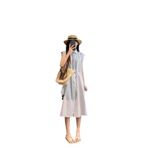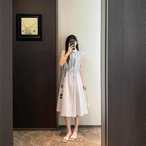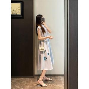 视觉降温 小众烫金印花蓝色裙子小飞袖收腰A字衬衫裙气质连衣裙女