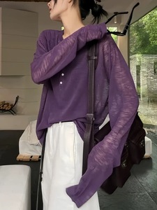 フレンチハーフオープンカラー長袖Tシャツレディース夏薄手ゆったりレイジースタイル日焼け止めブラウス高級ニットトップス