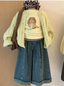 2025女童秋款绿色粗针毛线小狗内搭三件套