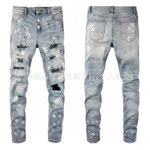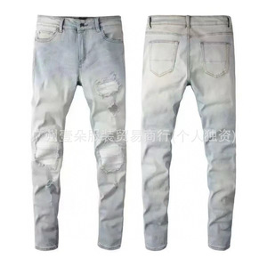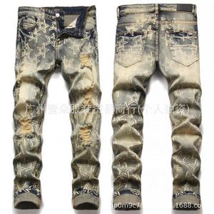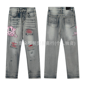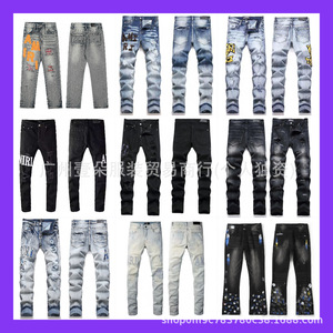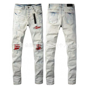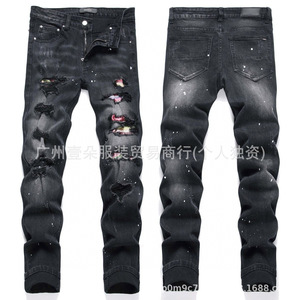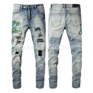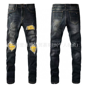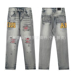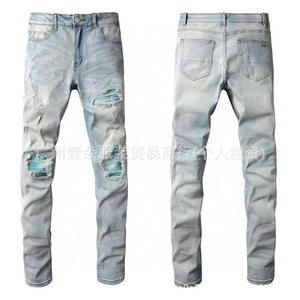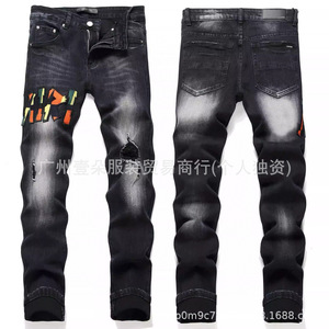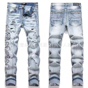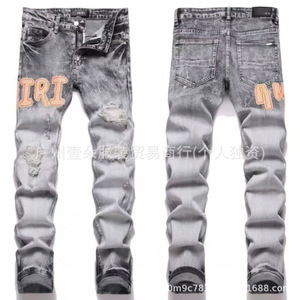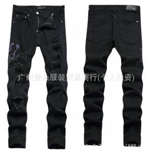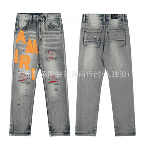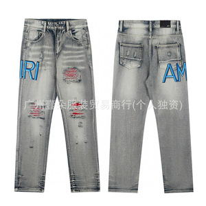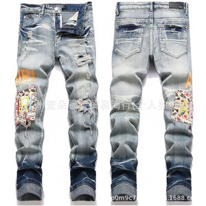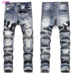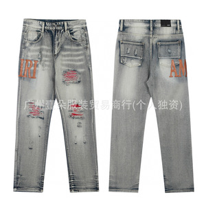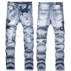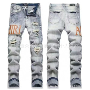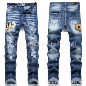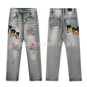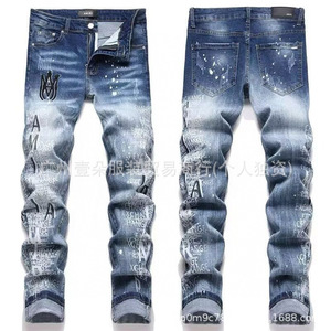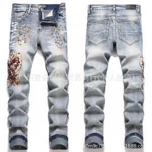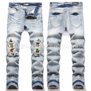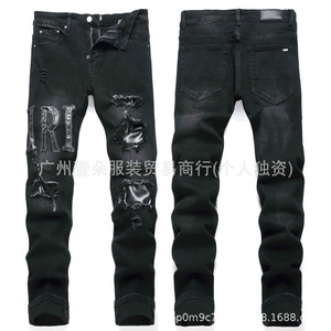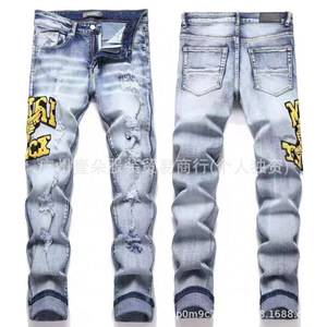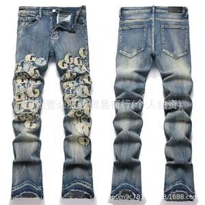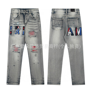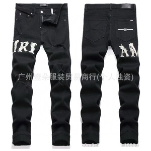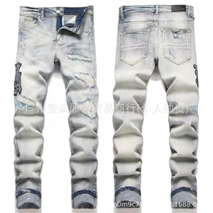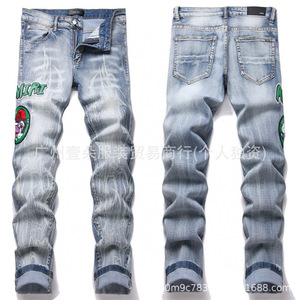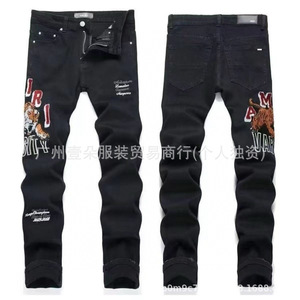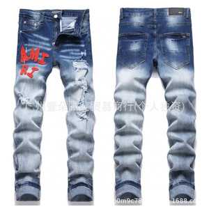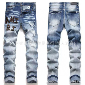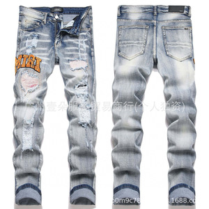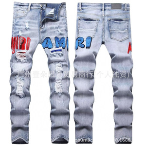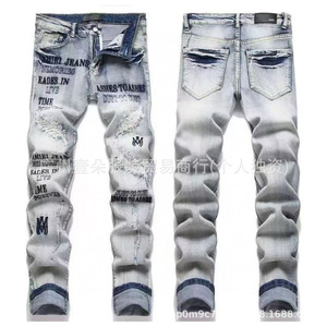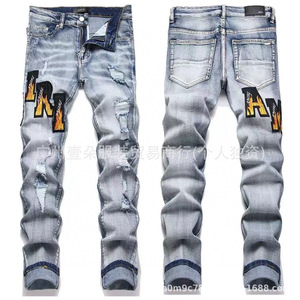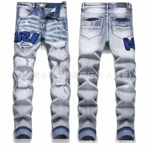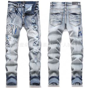 美式高街高品质AM字母刺绣牛仔裤男百搭修身洗水小脚长裤网红同款