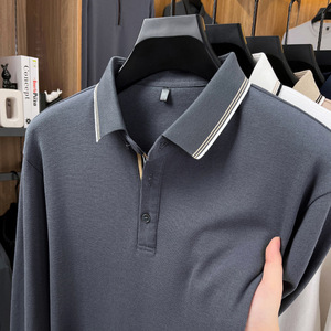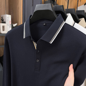 跨境纯棉男士t恤夹条宽松时尚休闲百搭高级感翻领Polo衫长袖t恤男