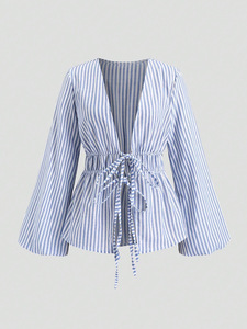 2025 秋の新ヨーロッパとアメリカンスタイルのストライプシャツ長袖レースアップシャツカーディガンクロスボーダー Amazon 婦人服