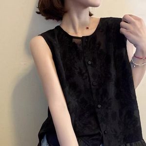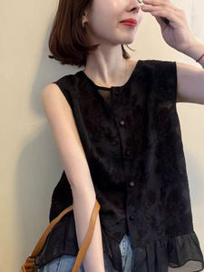 黑色圆领提花无袖背心衬衫女25夏季新款荷叶边设计感洋气显瘦上衣