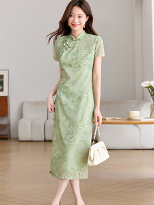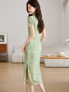 收腰印花旗袍裙夏季新款复古风桑蚕丝长裙简约气质优雅高腰连衣裙