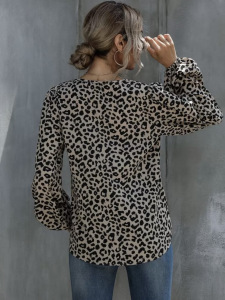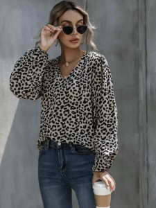 欧美女装2025秋季新款豹纹长袖衬衫跨境亚马逊爆款时尚v领娃娃衫