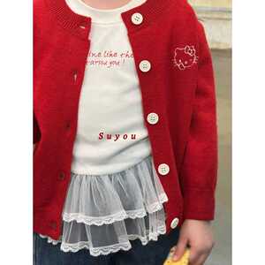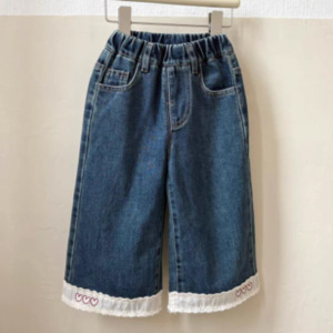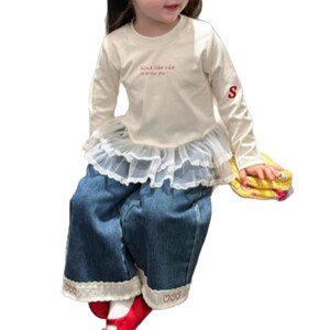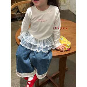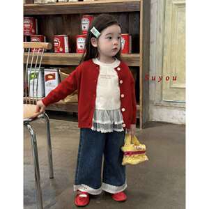 甜小司童装秋季新款女童小童韩版小猫刺绣针织开衫花边牛仔直筒裤