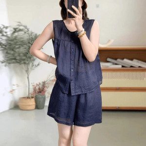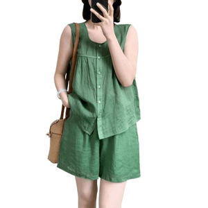 T5C棉麻套装女夏季大码胖MM宽松遮肚显瘦无袖上衣休闲阔腿短裤两