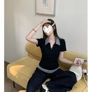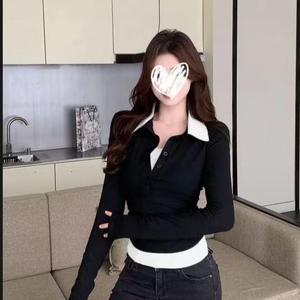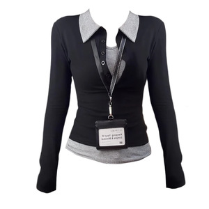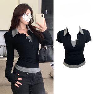 [真の二層] 2025初秋の新作ホットガールフェイクツーピーススプライスラペル長袖スリムフィットで多用途