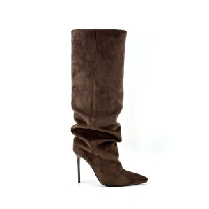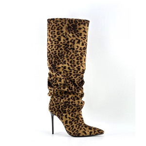 欧美风外贸春秋季新款细跟高跟鞋侧拉链褶皱高筒豹纹女靴时尚女靴