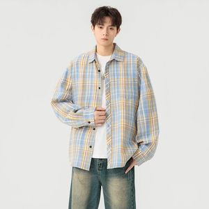 名绅门男装春秋季新款长袖格子衬衫男生宽松百搭休闲棉麻港风衬衣