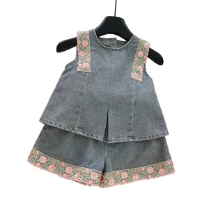 2025夏季新款女童牛仔短裤套装洋气牛仔爱心拼接上衣短裤两件套