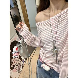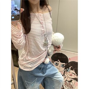 原版面料黑白条纹长袖t恤女夏薄款防晒薄纱罩衫上衣斜肩露肩辣妹