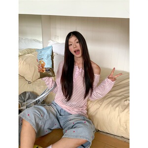 原版面料美式慵懒高级感条纹长袖气质上衣女夏休闲显瘦薄款打底衫