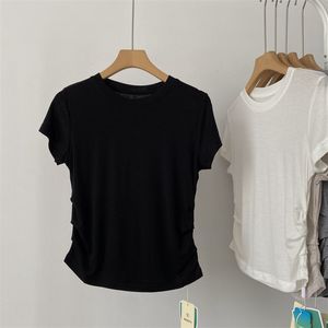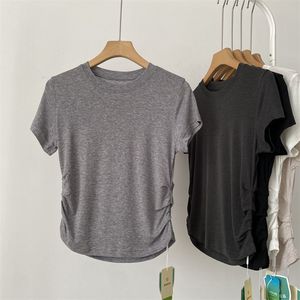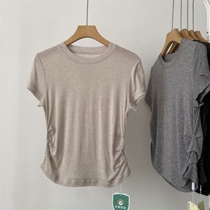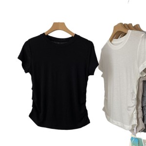 显瘦薄款天丝不规则上衣莱赛尔褶皱收腰修身正肩面膜短袖T恤女夏