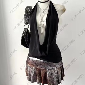 复古辣妹必备黑色挂脖荡领背心搭镭射荷叶短裙时髦炸街上衣