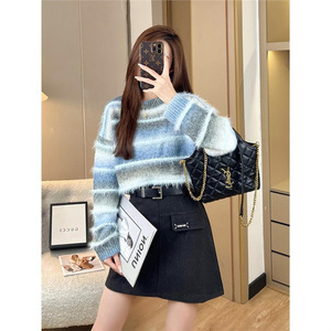 優しいスタイルの長袖ストライプカラーブロックラウンドネックプルオーバーセーター女性の秋のスリムフィットショートセータースイートスタイルトップ