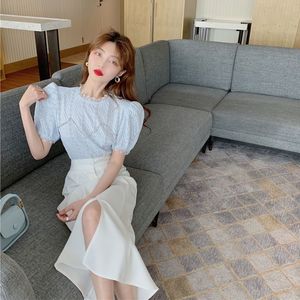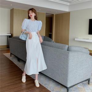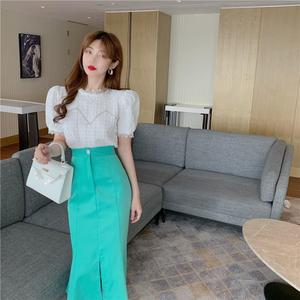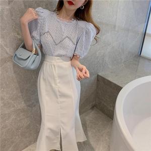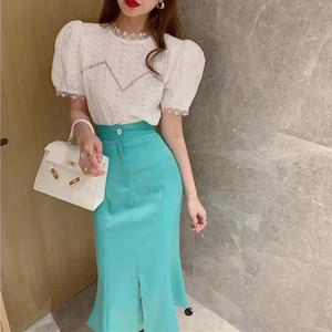 2025年春新作レディーススーツ半袖レースシャツトップ+ハイウエストスリットスカート2点セットイン