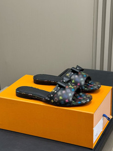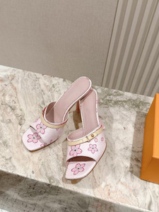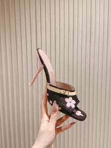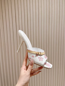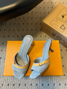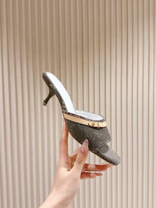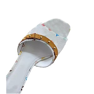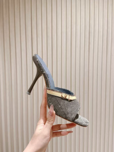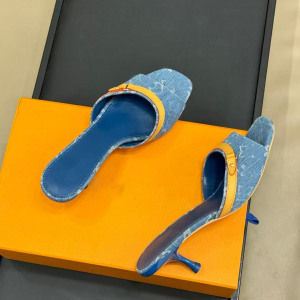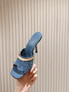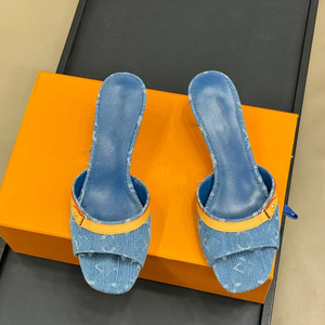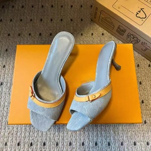 高定2025新款真皮细跟高跟一字拖牛仔布复古气质三彩 女夏凉拖鞋