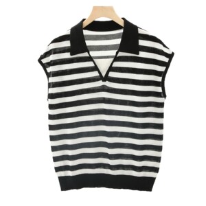 レンチングテンセルストライプラペルベスト、ゆったりとした黒と白のVネックノースリーブシャツベスト卸売