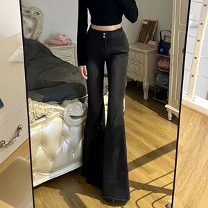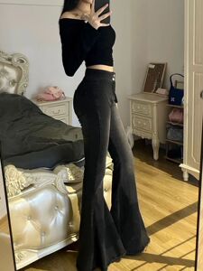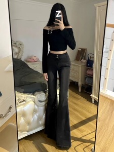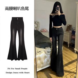 辣妹小个子高腰喇叭鱼尾牛仔裤女弹力毛边显瘦复古拖地马蹄长裤子