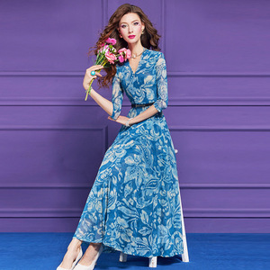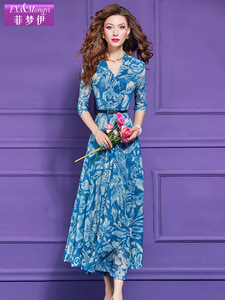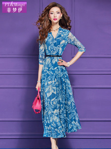 Feimengyi ブループリントドレスレディース秋の新スタイル軽くて成熟した美しいウエスト V ネック大きいサイズのスカート