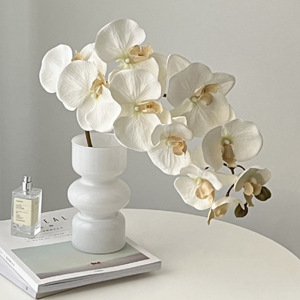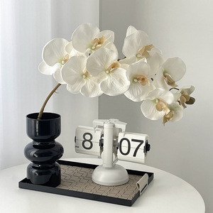 黒の三波花瓶 + 白の胡蝶蘭 + 四角い革のトレイ + ページをめくる白い時計
