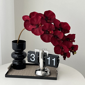 黒の三波花瓶 + 赤の胡蝶蘭 + 四角い革のトレイ + ページをめくる黒い時計