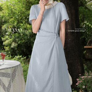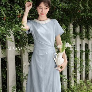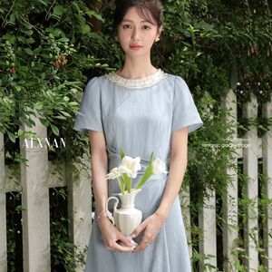 夏季法式温柔2025气质短袖连衣裙收腰高级休闲显瘦蓝色新款长裙子