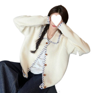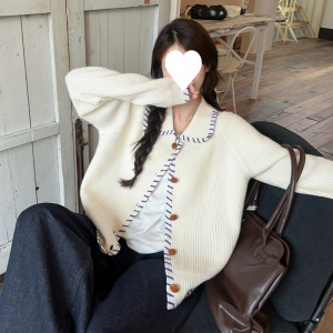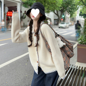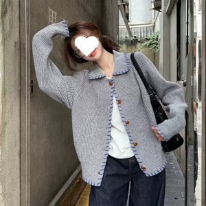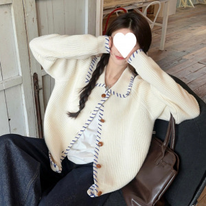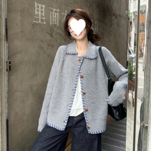 韩系高级感翻领菱格绑带毛衣外套女秋冬季宽松慵懒风外穿针织上衣