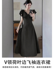 黑色v领法式赫本风连衣裙女收腰小飞袖长款裙子夏日绝美小黑裙子