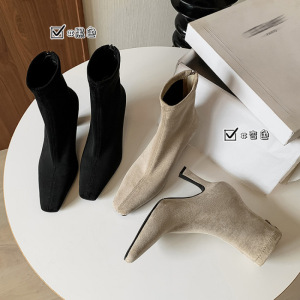 2025新款韩系方头细高跟弹力绒面瘦瘦靴大码卡其色短靴女春秋单靴