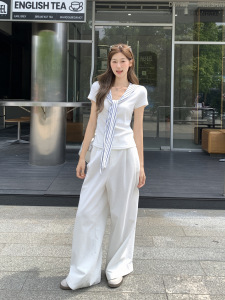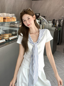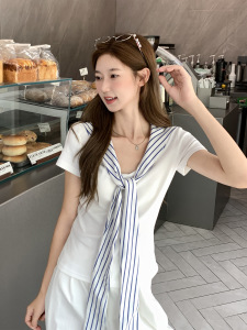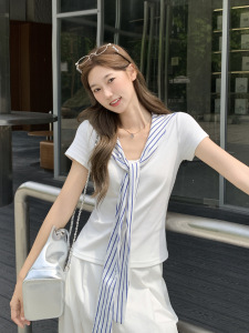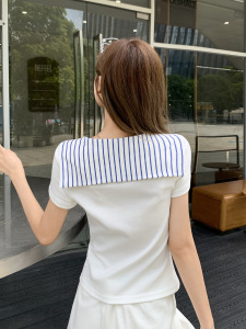 韩系白色学院风海军领正肩短袖T恤女夏季新款假两件披肩修身上衣
