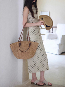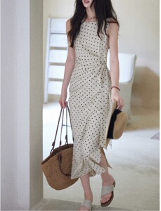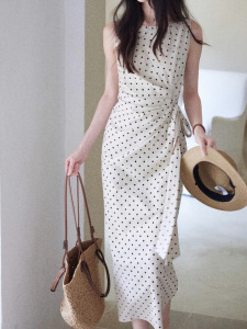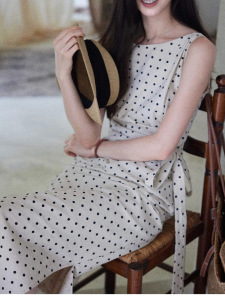 【松间月】高级感气质波点连衣裙女侧收腰亚麻棉法式长裙