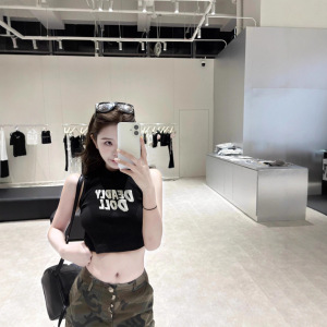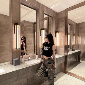 高品质~夏季复古风立领无袖梵文字母图案辣妹风短背心迷彩长裤女
