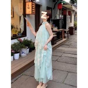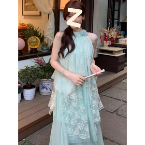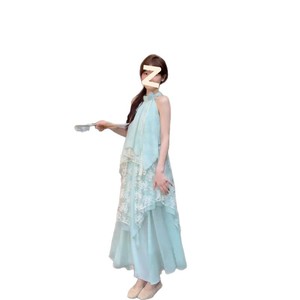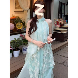スーパーフェアリーリゾートスタイルオフショルダーホルターネックドレス夏韓国純粋な欲望レースステッチ不規則なレースロングスカート女性のための