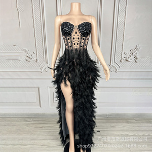 欧美黑天鹅气质满钻羽毛连衣裙成人模特走秀潮服生日轻奢礼服